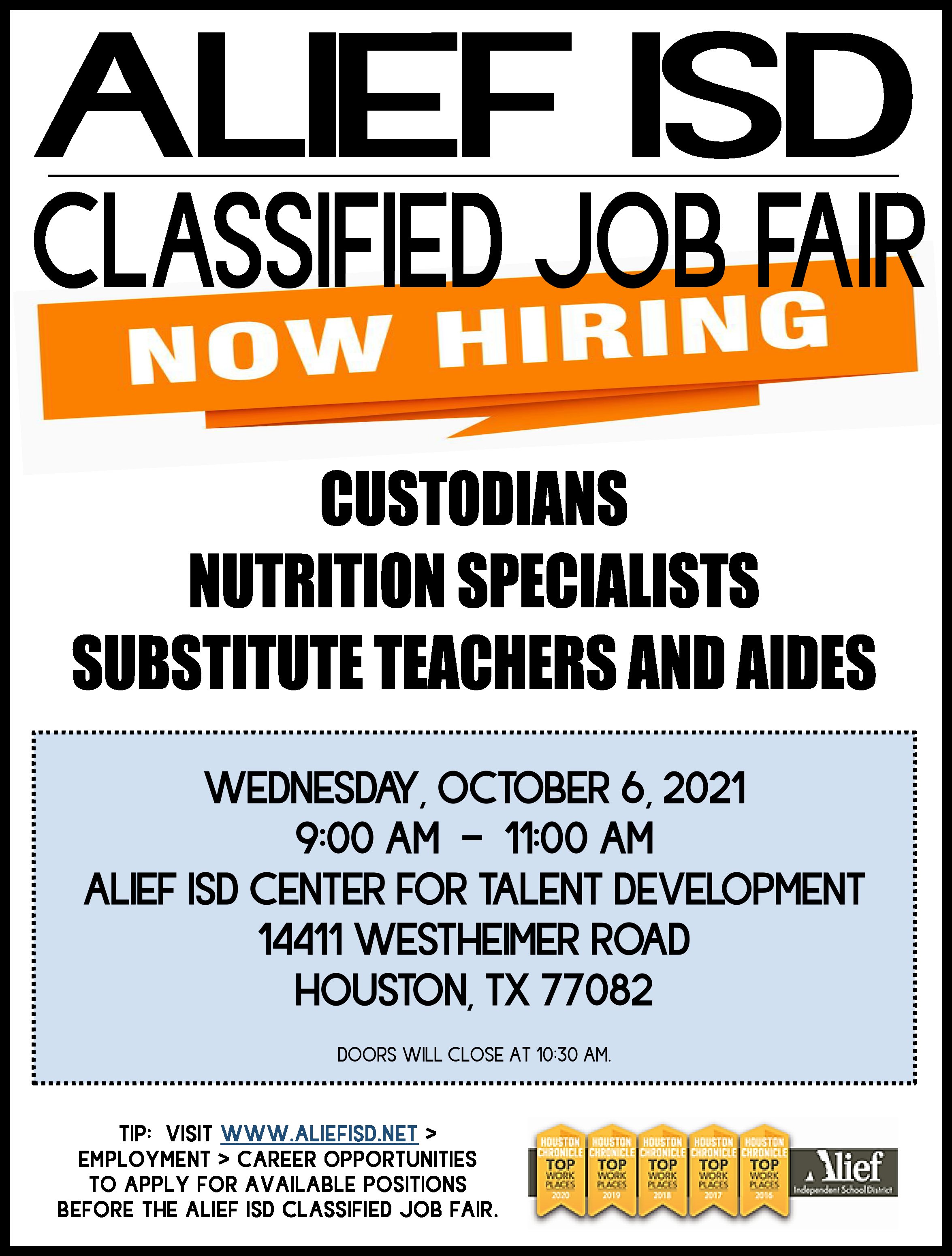 Alief Isd On Twitter Alief Isd Is Looking For Custodians Nutrition Specialists Substitute Teachers Amp Aides Job Fair October 6 From 9 11 A M Https T Co Bahqg4fvj6 Twitter